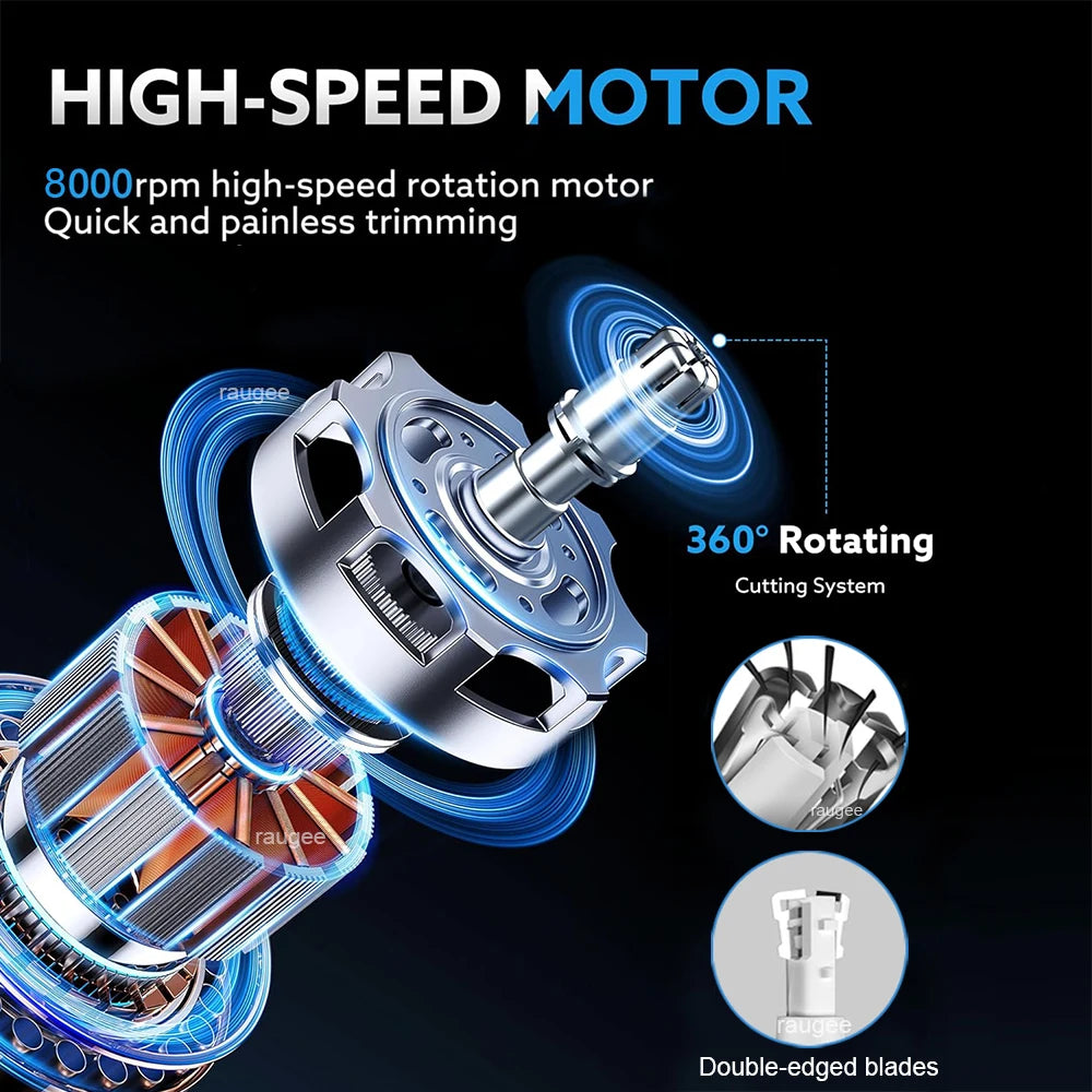 【Safe & Efficient】The trimmer features a dual:edge stainless steel blade system with an internal 360° rotation design, ensuring efficient cutting, painless operation, and no leftover hair, allowing for easy breathing.