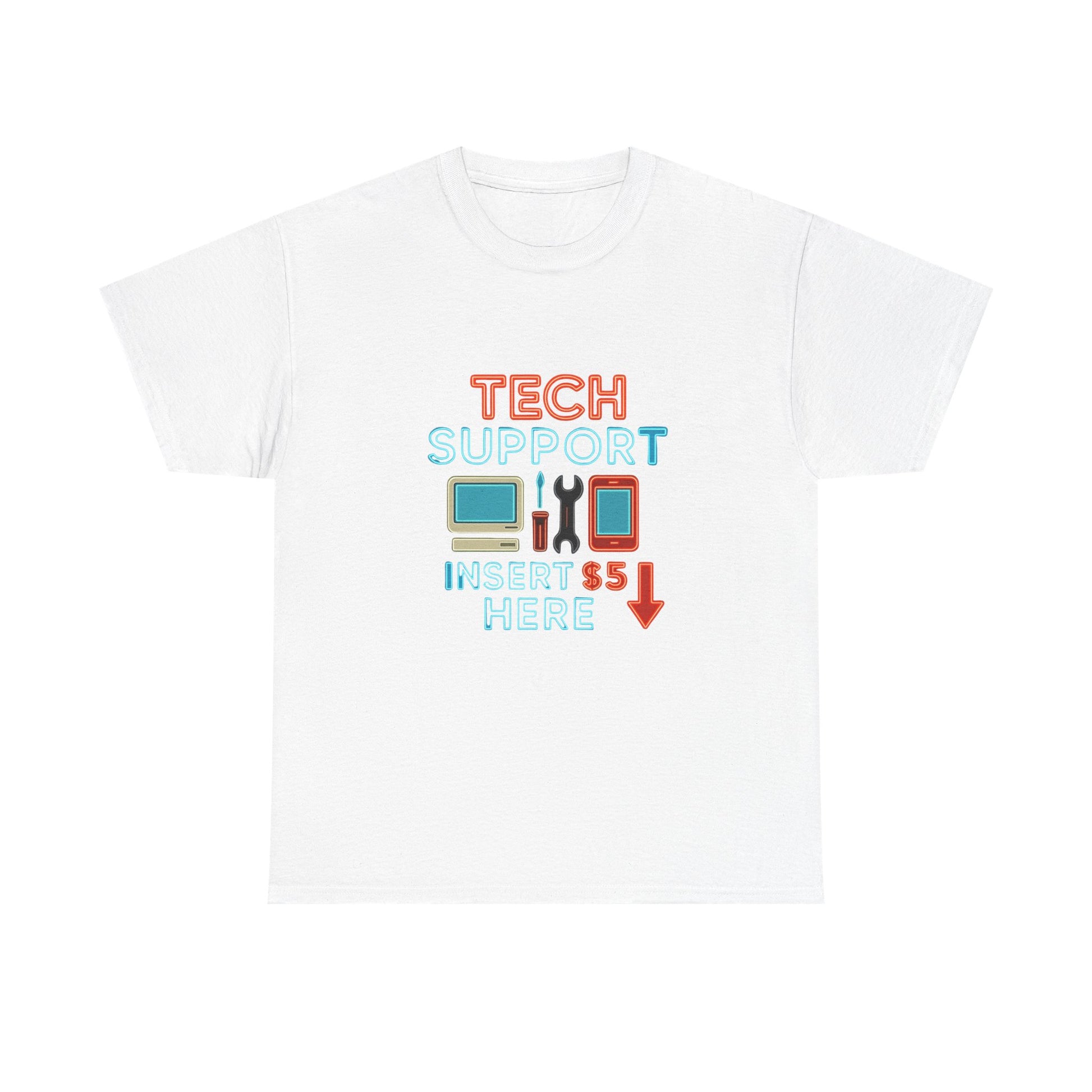 Light, playful, and a little cheeky — this classic crew tee wears its humor on the chest. A soft white tee printed with retro tech icons and a bright, tongue-in-cheek “TECH SUPPORT INSERT $5 HERE” design. The relaxed cut and smooth, sturdy fabric make it comfortable during long troubleshooting sessions, meetups, or casual days at the office. It feels familiar: breathable cotton that holds up wash after wash and a collar that keeps its shape, so the shirt stays ready for impromptu help requests or coffee-fueled debugging marathons.